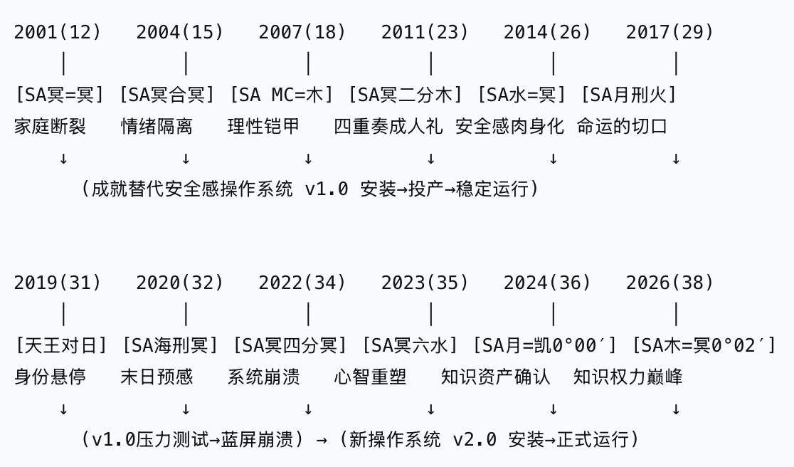 | 土星/天王星 | 12、15、23、31、34、36岁 | 责任与自由的永恒张力。用最不自由的方式换取最根本的自由 |